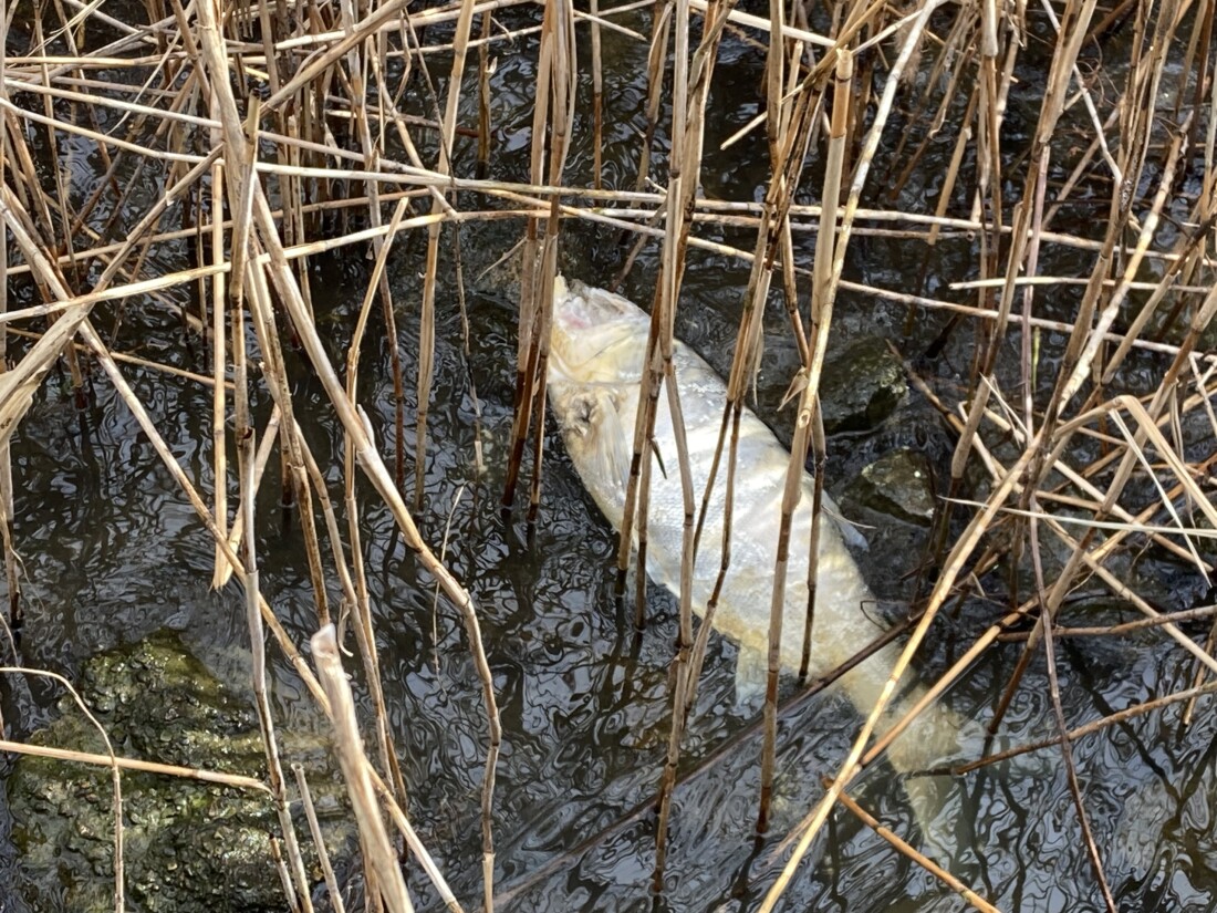 臭いに気づき湖面を見ると、50cm以上魚が横たわっていました。