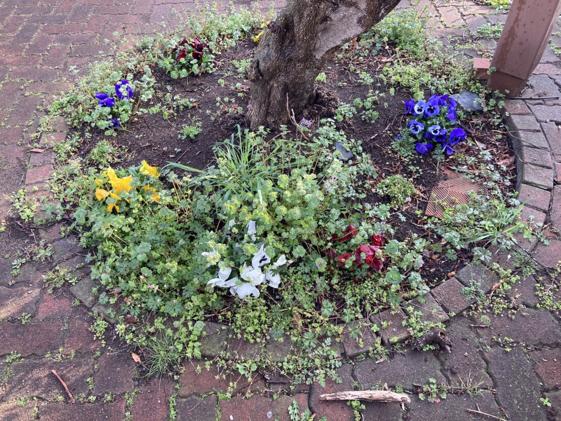 早朝のボランティア作業は寒さ対策が大変でしたが、気温も上がって来て、その心配もなくなりました。 パンジーが雑草で埋もれてたので、取り除きました。 昨夜雨が降ったお陰で、草が抜きやすくて作業も捗りました。